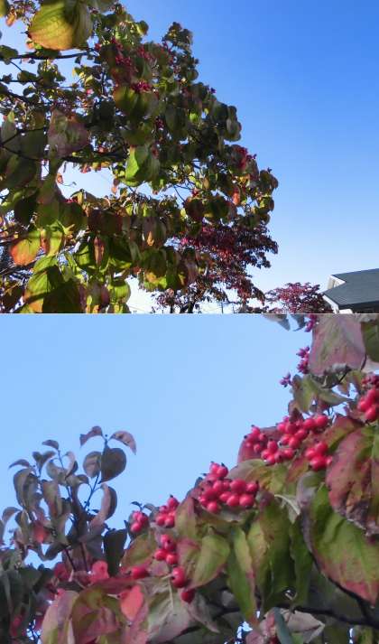 春、美しい花を咲かせていた浅井中小学校のハナミミズキも、秋になり赤くつやつやした実をつけています。とてもつやつやしていておいしそうに見えますが、私たち人間が食べることはできません。毒はありませんがとても渋くて、おいしくありません。しかし、鳥たちには大人気です。ヒヨドリ、ムクドリ、オナガなどが食べに来ます。赤い実とともに鳥を見て楽しみましょう。