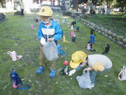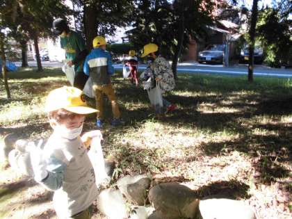 校庭では拾えなかったどんぐりやまつぼっくり、きれいな色の柿の葉を見つけることができました。たくさん拾った子が「どうぞ。」とおすそ分けしてくれました。