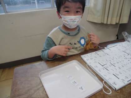 活動の様子【10月17日(月)のたんぽぽ】 公開日 2022/10/17 更新日 2022/10/17 たんぽぽ 国語の時間に、ひらがなカードを並べる学習をしています。いつもは、先生が言った言葉を聞いて、カードを並べていますが、今日は自分で考えた言葉も並べました。