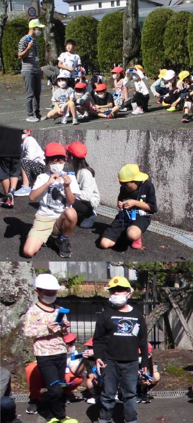 校舎によってできた日陰や人の影の向きと太陽の位置を観察しています。
