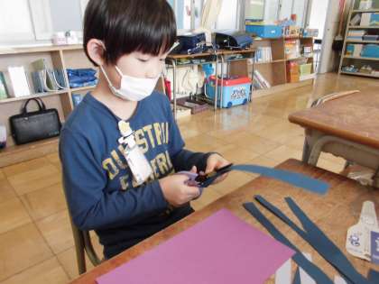 交流クラスの音楽では、リズムにのって元気よく歌いました。生活単元では、季節の掲示物を楽しく製作しました。