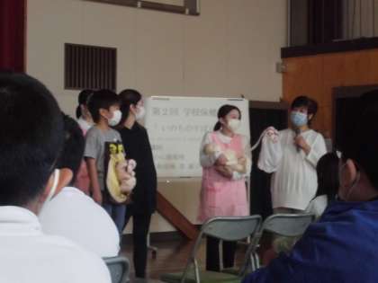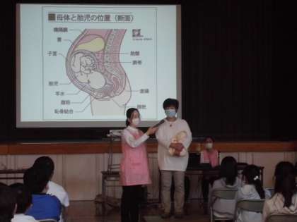 命がどうやって生まれるかを、助産師さんが映像や、具体的な大きさを表した人形などを使って、体感しました。実際の妊婦さんにもインタビューをして、命の大切さを学びました。