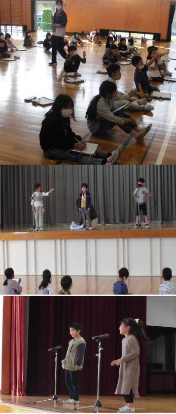 N-1グランプリに向けて【10月21日(金)2年生】 公開日 2022/10/21 更新日 2022/10/21 2年 初の舞台練習を行っています。聴いている子が温かい心で聴いているので、演技する子は安心して初舞台をがんばっています。緊張するとセリフが早くなる子が多いようです。ゆっくりと話す練習をしていきましょう。