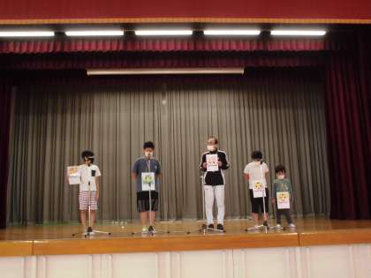 活動の様子【10月24日(月)のたんぽぽ】 公開日 2022/10/24 更新日 2022/10/24 たんぽぽ たんぽぽクラスで、初めて体育館でN-1グランプリの練習をしました。マイクの使い方、立ち位置などを確認しました。