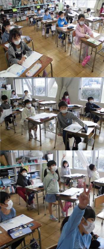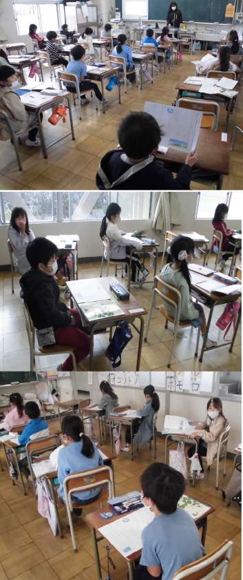 くじらぐも【10月25日(火)1年生】 公開日 2022/10/25 更新日 2022/10/25 1年 「天まで とどけ、一、二、三」が3回繰り返されています。3回とも同じように読むのではなく、どのように変えて読めばよいのかなど、読み方の工夫を考えています。