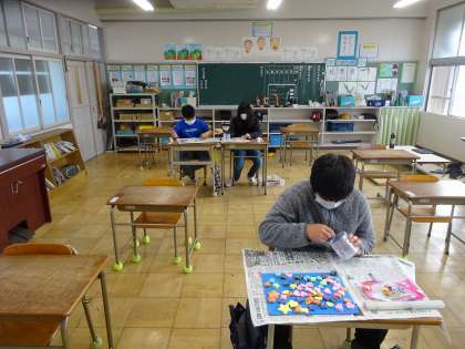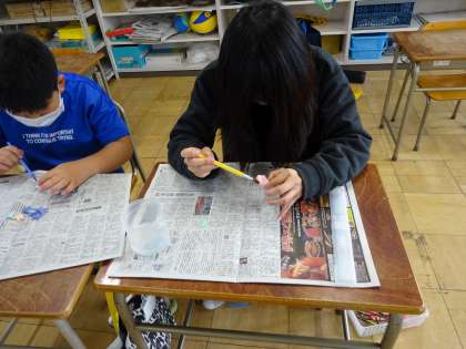 紙粘土で作った飾りにニス塗りをしました。飾りが輝きました!