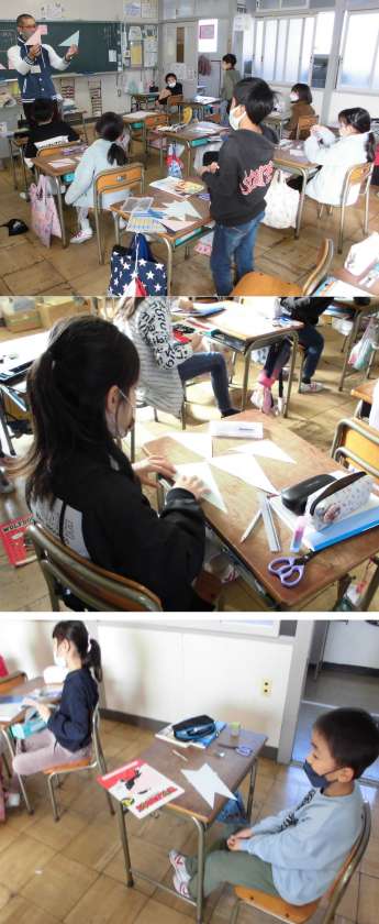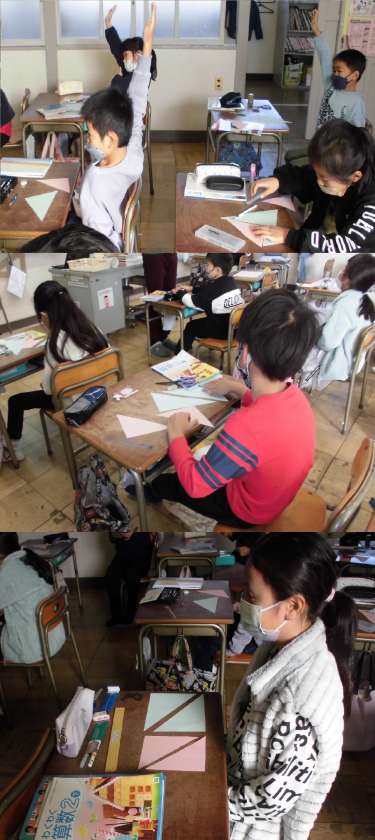 長方形や正方形の紙を対角線で切って、できた三角形について調べています。