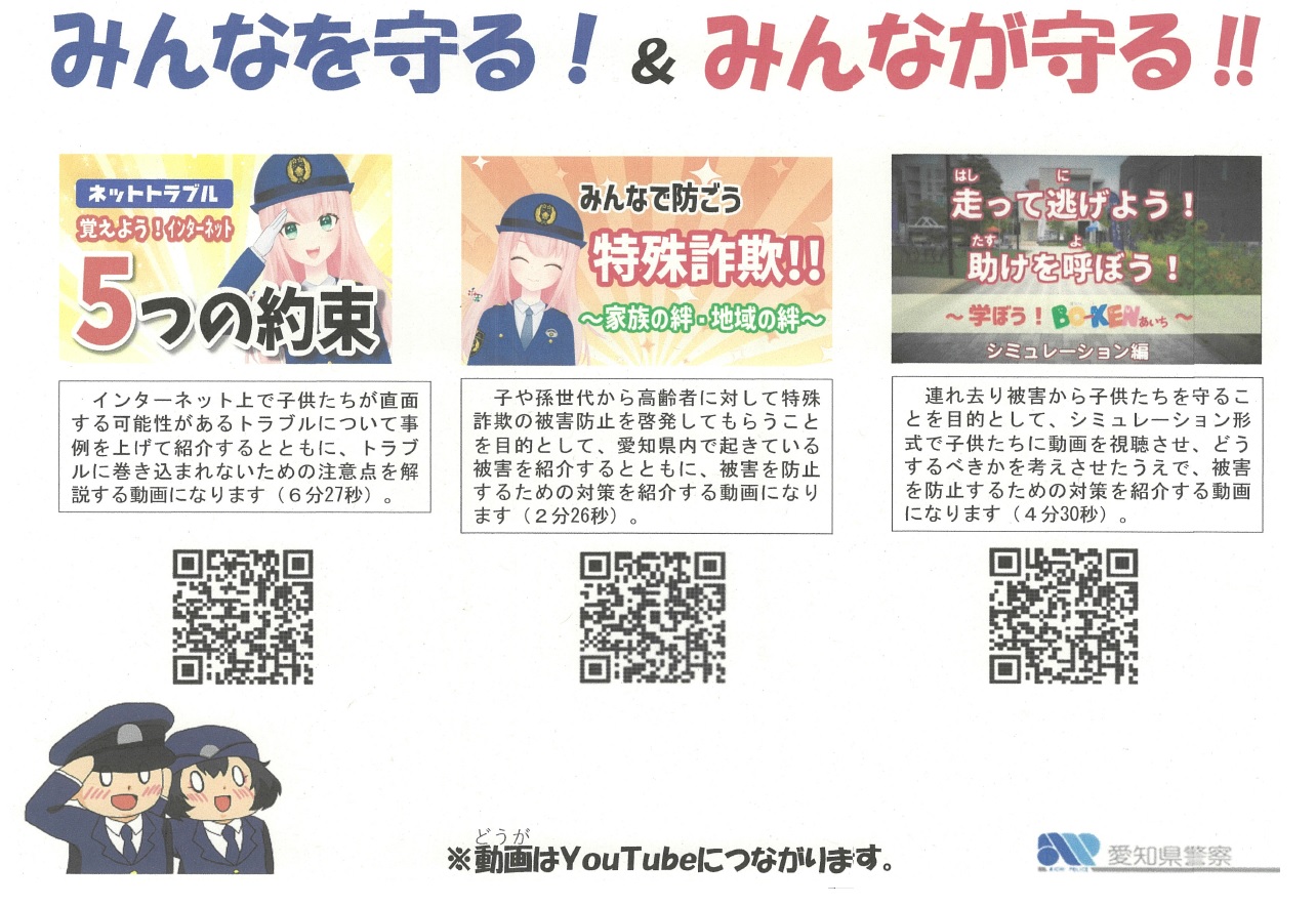 一宮警察署生活安全課より一宮市教育委員会を通して、県警防犯動画案内チラシ(下記画像)をいただきました。みなさんの命は自分だけのものではない、大切な大切な命です。事件・事故から自分の身を守りましょう。