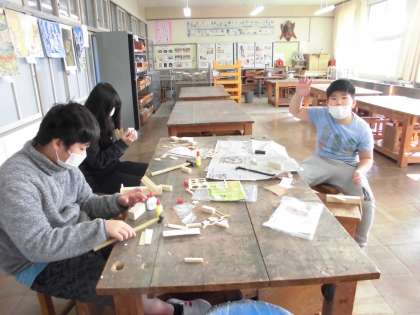 活動の様子【12月9日(金)のたんぽぽ】 公開日 2022/12/09 更新日 2022/12/09 たんぽぽ 高学年の図工の様子です。板や木片を組み合わせ、釘と金づちで固定して、思い思いの作品を作っていました。