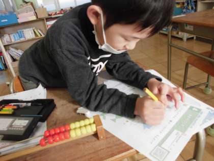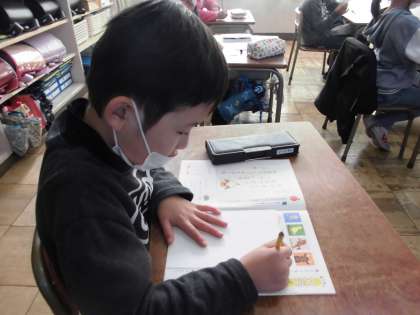 活動の様子【12月9日(金)のたんぽぽ】 公開日 2022/12/09 更新日 2022/12/09 たんぽぽ 2時間目は算数で、たし算・引き算・図形のプリントをやりました。 3時間目の書写では、「あけましておめでとうございます」と年賀状を書く練習をしました。