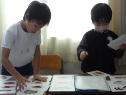 食べ物カードを出して見ていたところ、「この中で一番好きな食べ物は?」と聞かれたので、全てのカードを並べようと机いっぱいに広げていました。