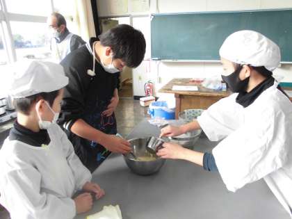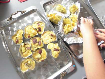 いも掘りをさせていただいたさつまいもを使って、蒸しパンとスイートポテトを作りました。固いおいもを切ったり、蒸したおいもをたくさんつぶしたりと、大変でしたが、楽しく調理できました。