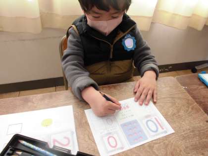 算数の時間です。「10」を書く練習をして、○を10個、赤鉛筆で塗りました。