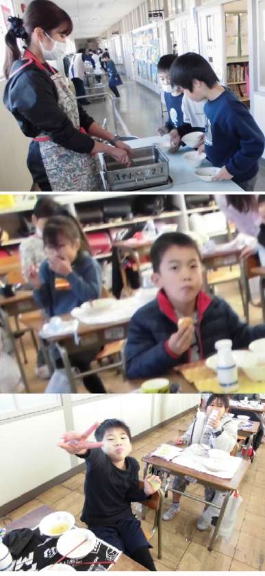 給食の時間です。おかわりをする子がたくさんいます。会話は、なかなかできないけれど、笑顔でいただいています。