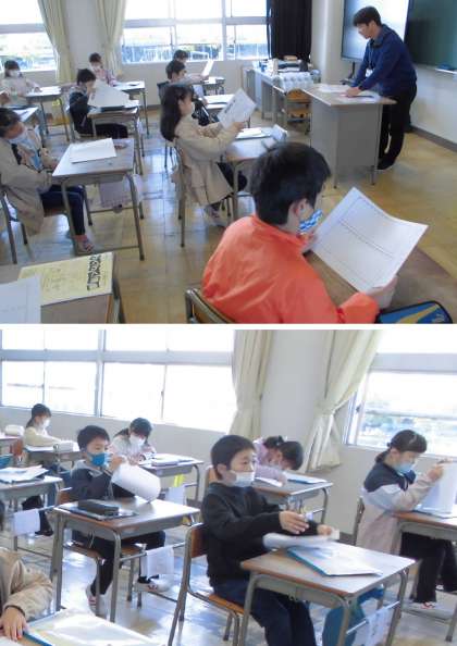 配布物の説明を聞いています。「音読カード」など、3年生の学習がスタートしようとしています。