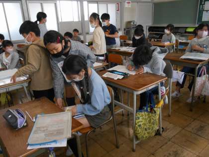 学校で保管する教科書などを集めます。 みんなで協力すると早くできますね!