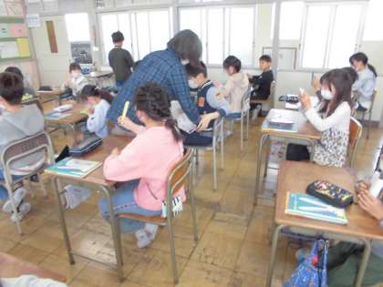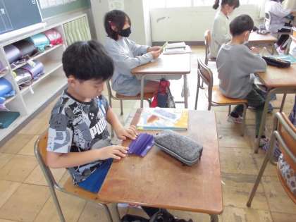 丸くひらくおうぎを色紙でつくっています。これから、これを使って角の勉強をしていきます。