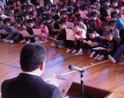 万引き防止キャンペーン(12/8) 公開日 2010/12/08 更新日 2010/12/08 学校行事 本日、臨時に学校集会を行いました。一宮警察署の生活安全課の方をお招きし、「万引き防止」にかかわるお話を聞きました。低学年の児童の中には「万引き」を知らないという子もいましたが、「万引き」は「泥棒」といっしょのことだよという署員の方のお話に納得した様子でした。もちろん、浅井中小の全員、万引きなんてこれからも絶対にやりません。