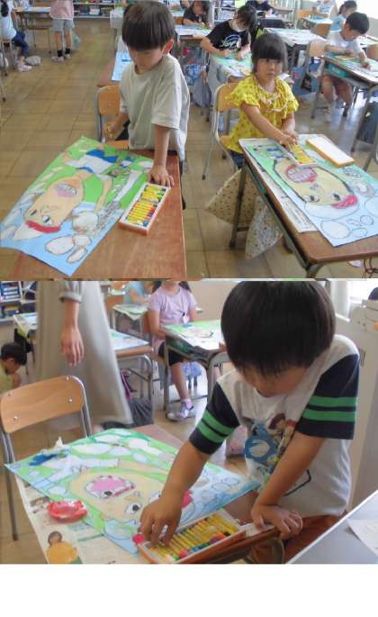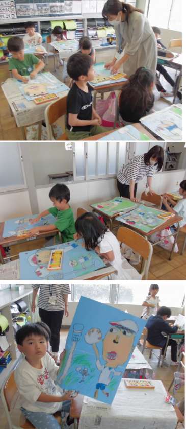 運動会で演技した玉入れの様子を絵にしています。丁寧に色塗りをしています。