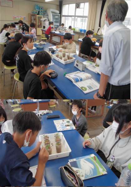メダカのたんじょう【6月6日(火)5年生】 公開日 2023/06/06 更新日 2023/06/06 5年 メダカの雄と雌を観察し、卵がどのように変化して子メダカになるかを勉強しています。後半は、発芽した植物を元気に育てるため、間引きをしました。