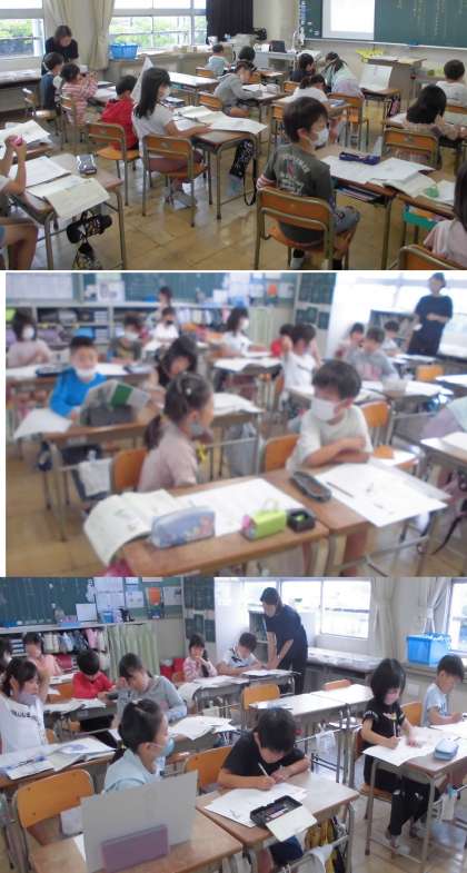 考えた道具の形や働き、あったらいいと思うわけについて二人組で質問し合い、よりくわしく書こうとしています。