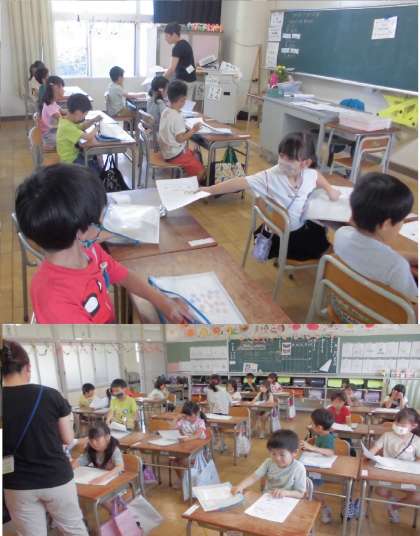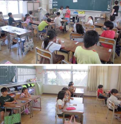 日直さんの司会で、朝の会が進められています。その後、先生よりプリントが配られています。渡す子は「どうぞ」受け取った子は「ありがとうございます」と言いながらプリントを配っています。今日の連絡プリントは6月15日(木)の午後に行われる「親子歯磨き教室」のについてでした。