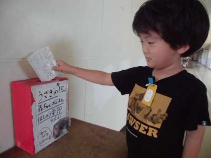 児童会で応募している子ウサギの名前をおうちで考えてきました。朝、下駄箱前の応募ボックスに入れに行きました。
