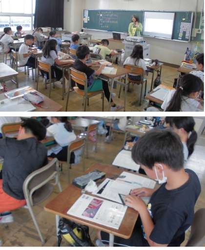 一組の三角定規を使って、垂直な直線や平行な直線をかいています。
