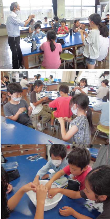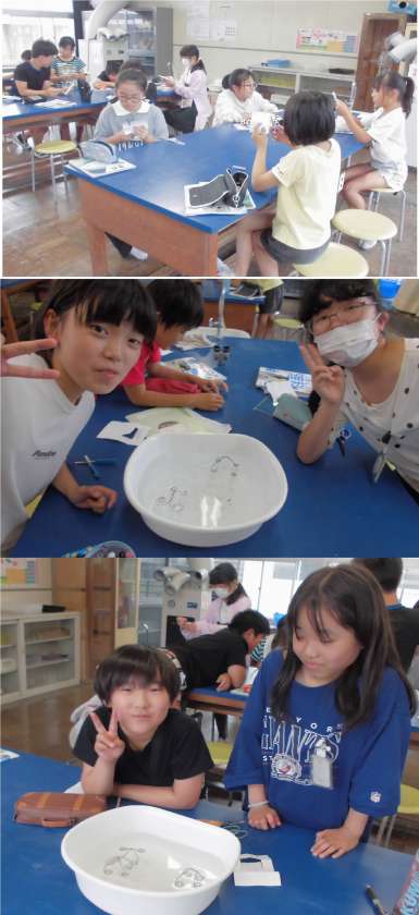 子どもたちのなぜを追究する心を育てています。メダカは水のなかにいますが、池にいたアメンボは水に浮かんでいます。なぜ?に対する実験をしています。コップすれすれに水を入れてもまだ水がこぼれず、真ん中が膨らんだ形になります。これは表面張力という力で水の真ん中が膨らんでいるのです。その力により、細いエナメル線で作ったアメンボが浮きます。浮いたエナメル線のアメンボを見て、満足顔の子どもたちでした。