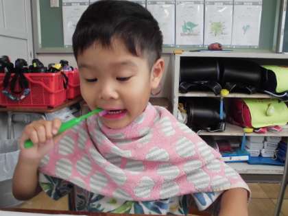 1年生で親子歯みがき教室がありました。染めだしをして、みがき足りないところがないか確認しました。これからの歯みがきも、しっかり取り組もうね!