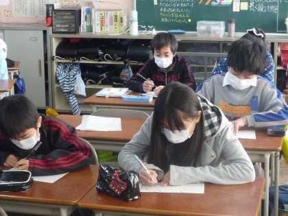 【3枚目の写真】2組の教室の様子です。今日は学級の半分以上の子が胃腸風邪の症状があり,欠席をしてしまいました。なんだか教室の様子もがらんとしていて,さみしそうです。欠席しているみなさん,じっくり休養してくださいね。早く回復するといいですね。
