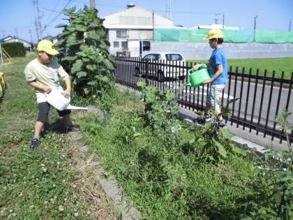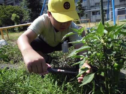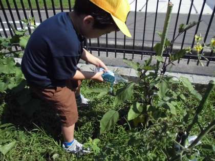 たんぽぽの菜園で、次々と野菜の実がつき始めました。収穫できたものを順に持ち帰っています。今日は、ピーマン4個とミニトマト4個がとれて、もらった子は「ピーマンの肉詰めを作ってもらおうかな。」と嬉しそうに持ち帰りました。