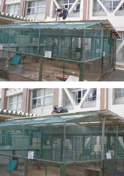 雨漏りがはげしいため、地域の方がボランティアで屋根を直しに来てくださいました。ウサギ小屋は、昭和58年卒業生の方々からの寄付で建てられました。偶然にも、直しに来ていただいたボランティアの方は、昭和58年に本校の卒業生だったことがわかりました。不思議なご縁に感謝いたします。