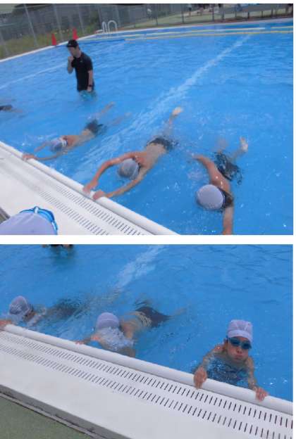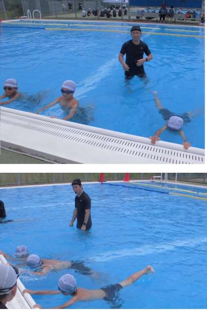 息つぎの仕方を意識しながら、ばた足泳ぎの練習をしています。