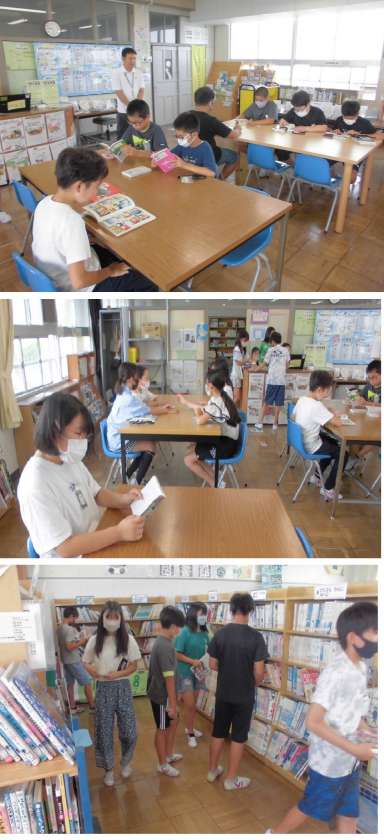 図書館で、興味のある本を選び読んでいます。夏休みも本に親しみましょう。