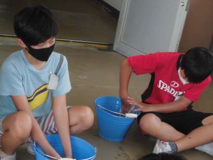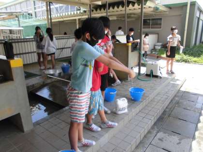 洗濯実習がありました。洗い、すすぎ、しぼりの手順で、給食の帽子をきれいに洗濯することができました。