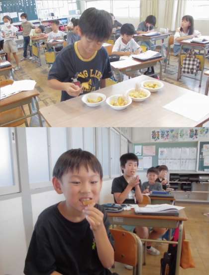 ガーデンサポーターさんが、心をこめて育てたジャガイモを収穫しました。アンデスとキタアカリという2種類のジャガイモを調理してくださいました。3年生のみなさんに、うれしいプレゼントとなりました。