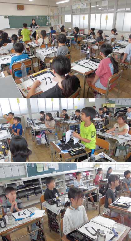 自分が書いた字とお手本の字を比べ、「おれ」や「はね」の筆使いについて考えている。