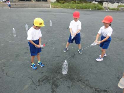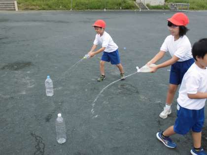 生活の勉強で、水遊びをしました。マヨネーズやケチャップの容器を使って、水鉄砲をしました。まとにしたペットボトルを友達と協力して倒す、誰が一番遠くまで飛ぶか競うなど、工夫しながら遊びました。子どもたちの笑い声が響く楽しい時間になりました。