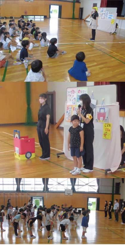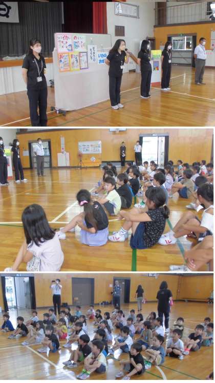 不審者による被害に合わないために、一宮警察の方々に来校いただき防犯教室を行っていただきました。合言葉いか‐の‐お‐す‐しを教えていただきました。これから、「知らない人についていかない」「他人の車にのらない」「おおごえを出す」「すぐ逃げる」「何かあったらすぐしらせる」に心がけていきましょう。また、ひとりで留守番するときは、カギを開けないようにすることも教えていただきました。最後に、ひとりで留守番しているとき、電話がかかってきたり、家にだれかきたりしたとき、どのように応対をすればよいか、各家庭に合った応対方法を、お家の人と話し合って決めてくださいという宿題をいただきました。各家庭で話し合ってみてください。