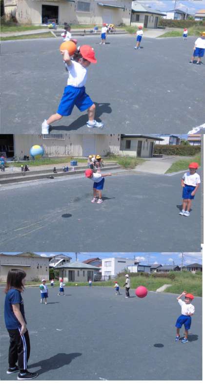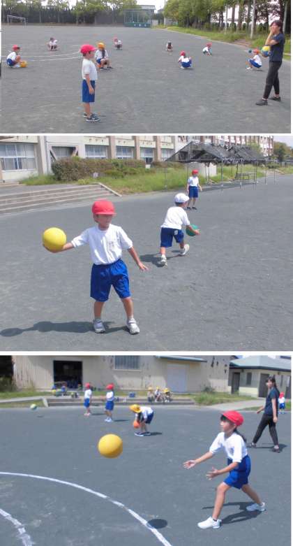 2人組になって、投げたり、はずませたりしたボールをキャッチしています。