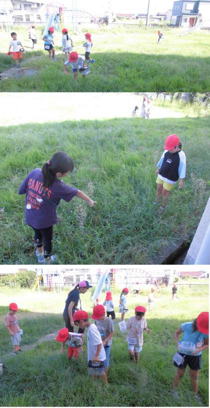 むしを さがそう【9月19日(火)1年生】 公開日 2023/09/19 更新日 2023/09/19 1年 低学年広場で、虫を探したり捕まえたりしています。「バッタがいる」「チョウがいる」など、喜びの声があかっていました。
