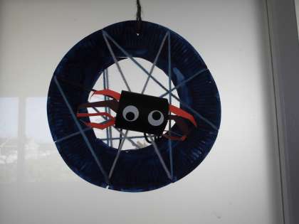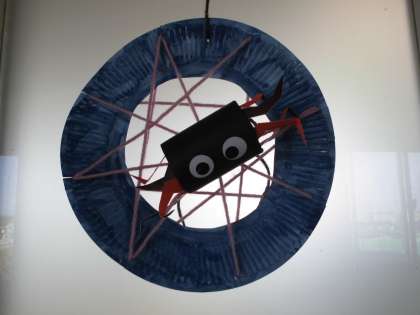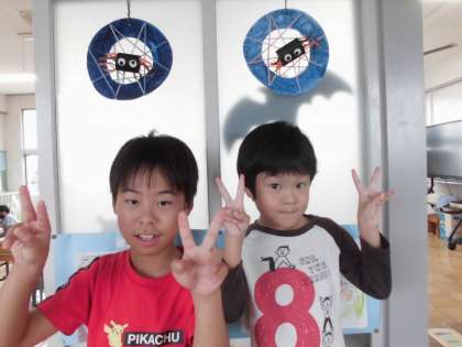 10月の掲示物が完成しました。31日はハロウィンです。くもの巣のリースを作りました。上手にでき上がりました。その1