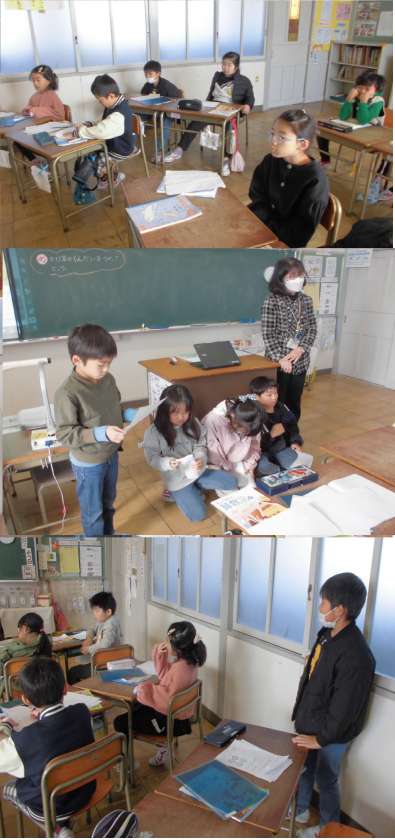 かけ算で表される場面を正しく判断し、かけ算の問題を考え発表しています。さらに、友達がつくった問題を解いて発表しています。