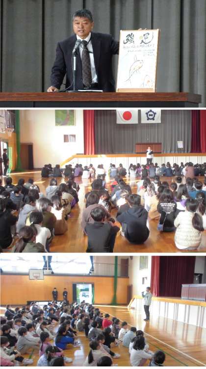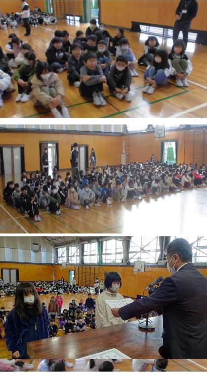 屋内運動場にて、全校集会を行いました。尾張教育書写コンクールの表彰に引き続き、N-1グランプリで養った、話す力・聞く力・すてきなあいさつは、浅井中小学校みんなのよいところであること。みんなの力でつくり上げた、温かい笑顔があふれる学校は、12月の人権週間に向けての大切な取り組みであることを話しました。