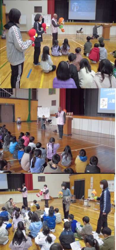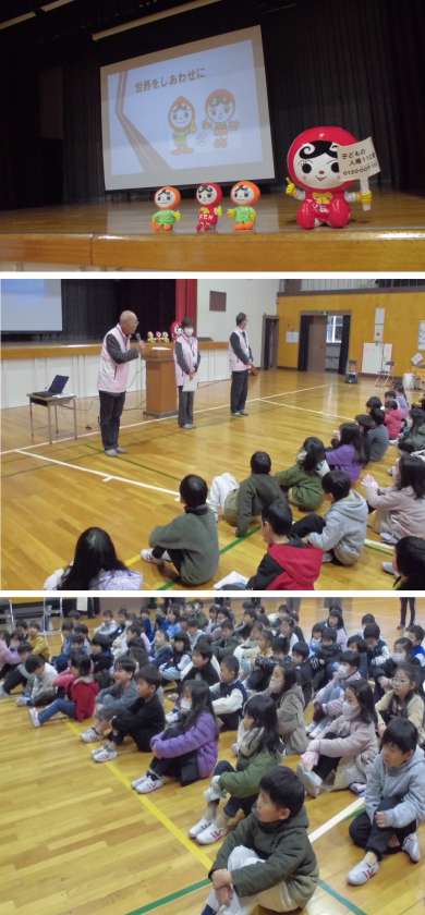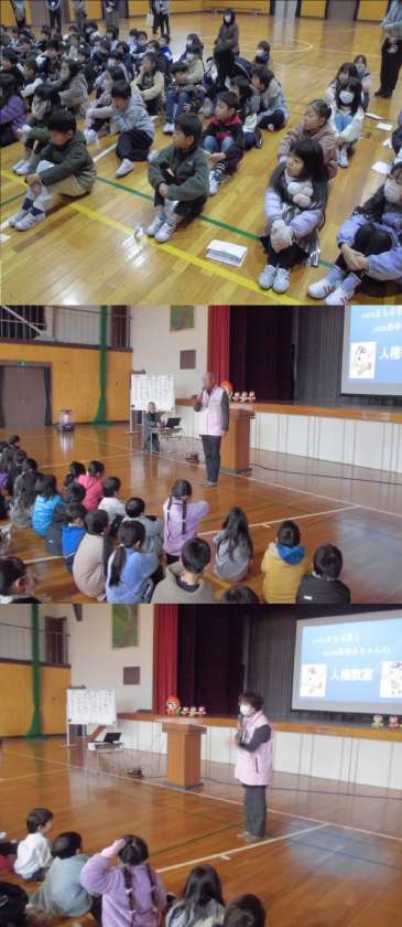 人権集会【12月5日(火)1,2年生】 公開日 2023/12/05 更新日 2023/12/05 人権・いじめ対策関連 人権擁護委員の方々に来校いただき、人権集会を行いました。人権とは何かを教えていただき、人権を考えるビデオ視聴をしました。人権に関するクイズには、みんな正しく答えることができました。これからも、優しさ・思いやりの心を大切に生活していこうとする気持ちが高まりました。人権擁護委員の皆様、ありがとうございます。