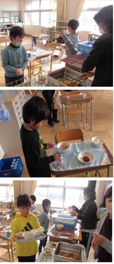 今日の献立は、ハンバーグです。みんなで協力して準備を進めています。「やったー、ハンバーグだ。」と喜ぶ声が聞かれました。