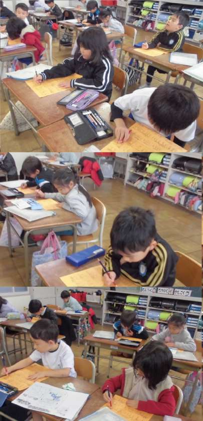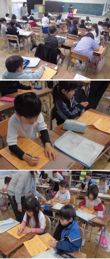 なわとびの技を確認しています。1年生でがんばる技を色鉛筆で○をつけています。