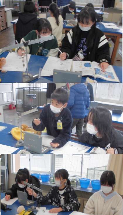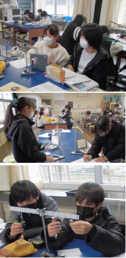実験用てこのうでが水平になってつり合うときのきまりを条件を整えて調べています。
