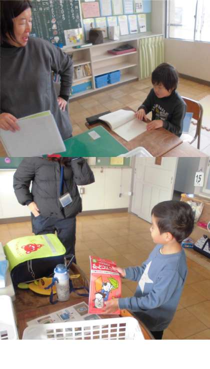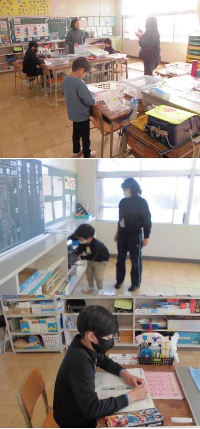 用具を整えたり、連絡帳を書いたりして、今日の準備を進めています。